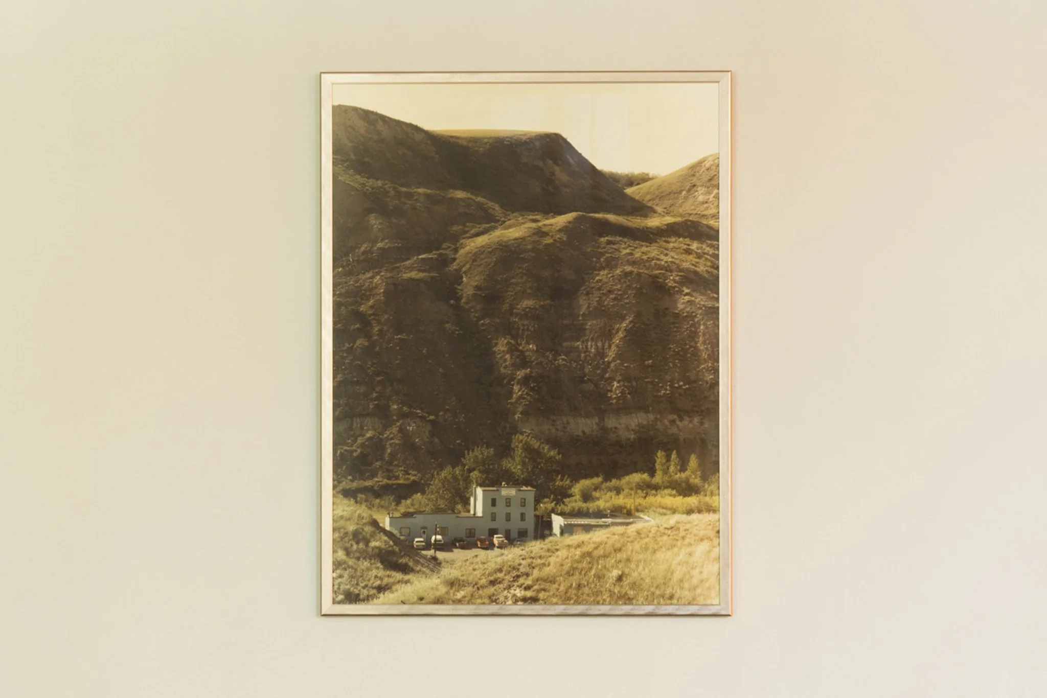 As a gesture to these spirits of the third floor, Nicole Kelly Westman alters the name of the Rosedeer hotel, to Rose, Dear. This splitting of language is mirrored in the exhibition space, with the gallery lobby divided in two. The first half of the gallery is lighter and displays a chromogenic photograph in its original rose-gold frame, on loan from the hotel lobby. The other half is darkened, its windows aglow in streetlamp sodium-vapour orange. In the immersive, darkened half of the gallery, is a cucoloris—a device used to shape shadow and light over subjects, commonly used to create intrigue on the faces and bodies of actresses during the film noir period—encased in a lightbox. However, Westman’s cucoloris is inverted; instead of casting shadow on its subjects, it becomes the subject of the work itself. Inscribed in the corner of the re-photographed apparatus is a text that reads, “it smells of sage out here, like an old friend,” perhaps a nod to the wild prairie sage that grows around Wayne.